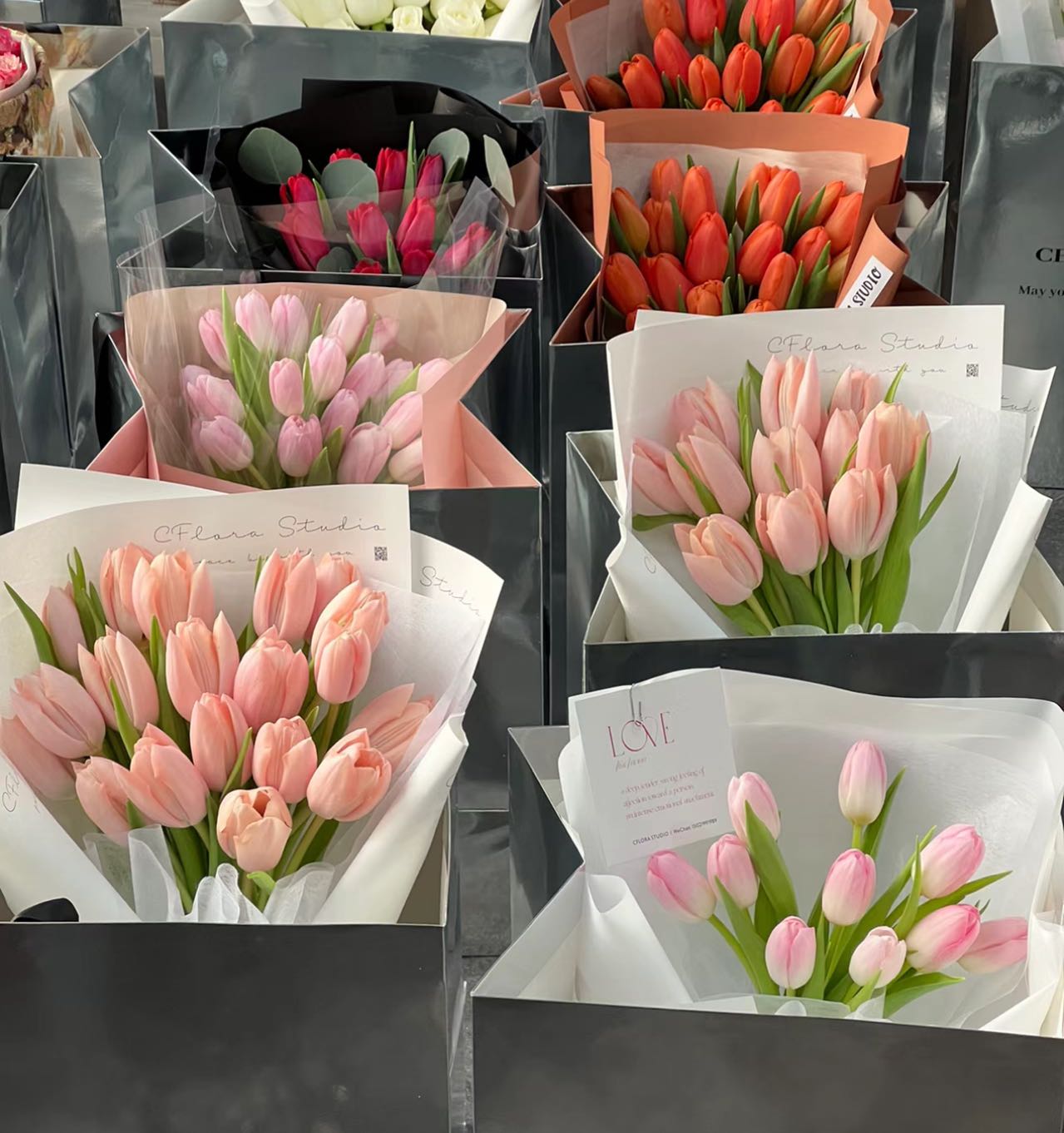 Colors will vary each day, from whites to pinks to reds and everything in between! There are two sizes: 10 stems and 20 stems which are both wrapped in layers of premium white tissue and white paper.